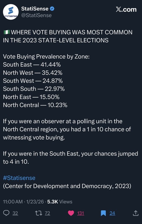 A user identified as John4B remarked that one of the suspects allegedly worked for a political party, describing the arrest as “very good.” However, others expressed deep frustration over the recurring nature of electoral corruption. One user, Shawarmagirl, lamented that “Nigerians should not waste their precious time to vote” if elections continue to be influenced by money, claiming that “the votes will not count.”